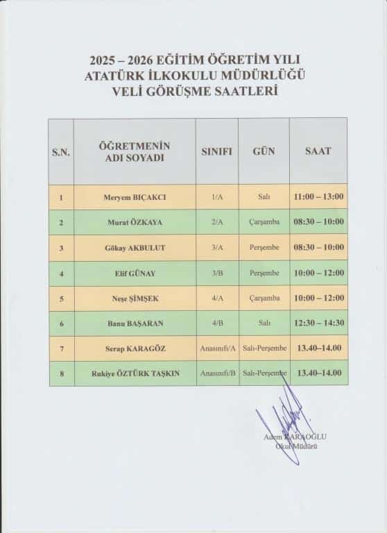 2025–2026 eğitim öğretim yılı kapsamında öğretmenlerimizle yapılacak veli görüşmeleri aşağıdaki çizelgede belirtilen gün ve saatlerde gerçekleştirilecektir.